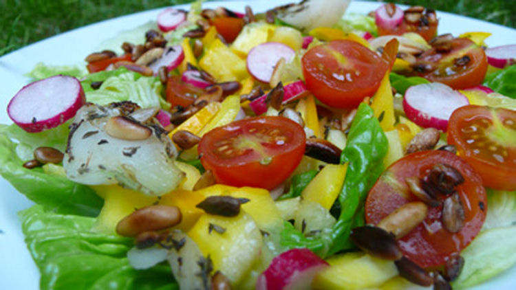 Coupez les oignons restant en 4 et faites-les colorer dans la poêle avec les pignons et les graines de tournesol